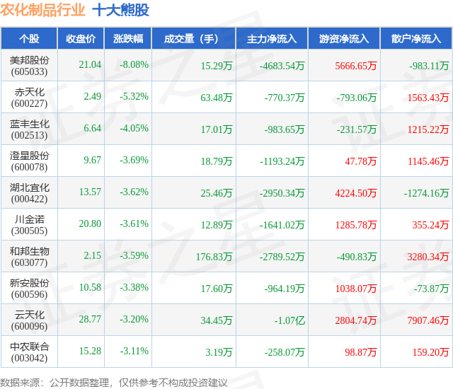 个股表现方面,农化制品行业当日领跌股为美邦股份(605033),该股当日报收21.04,下跌8.08%,成交量15.29万,主力资金净流出4683.54万元。赤天化(600227)以下跌5.32%紧随其后,该股当日成交量63.48万,主力资金净流出770.37万元。除此之外,蓝丰生化(002513)、澄星股份(600078)、湖北宜化(000422)均进入当日熊股之列。具体个股列表见下表: