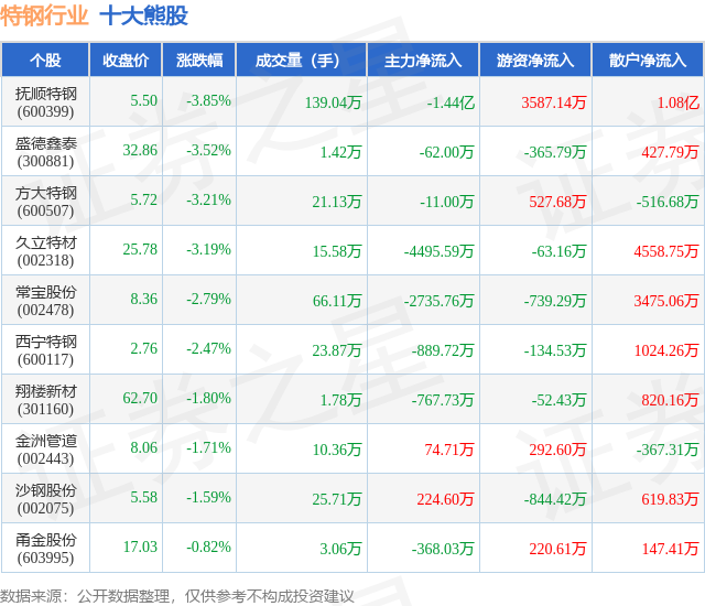个股表现方面,特钢行业当日领跌股为抚顺特钢(600399),该股当日报收5.5,下跌3.85%,成交量139.04万,主力资金净流出1.44亿元。盛德鑫泰(300881)以下跌3.52%紧随其后,该股当日成交量1.42万,主力资金净流出62.0万元。除此之外,方大特钢(600507)、久立特材(002318)、常宝股份(002478)均进入当日熊股之列。具体个股列表见下表: