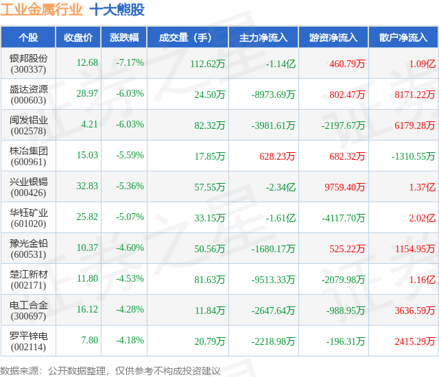 个股表现方面,工业金属行业当日领跌股为银邦股份(300337),该股当日报收12.68,下跌7.17%,成交量112.62万,主力资金净流出1.14亿元。盛达资源(000603)以下跌6.03%紧随其后,该股当日成交量24.5万,主力资金净流出8973.69万元。除此之外,闽发铝业(002578)、株冶集团(600961)、兴业银锡(000426)均进入当日熊股之列。具体个股列表见下表: