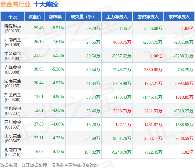 个股表现方面,贵金属行业当日领跌股为晓程科技(300139),该股当日报收29.46,下跌8.51%,成交量39.79万,主力资金净流出1.45亿元。西部黄金(601069)以下跌7.61%紧随其后,该股当日成交量27.65万,主力资金净流入4668.75万元。除此之外,中金黄金(600489)、赤峰黄金(600988)、湖南黄金(002155)均进入当日熊股之列。具体个股列表见下表: