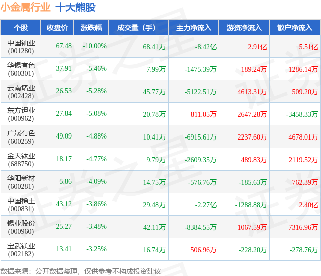 个股表现方面,小金属行业当日领跌股为中国铀业(001280),该股当日报收67.48,下跌10.0%,成交量68.41万,主力资金净流出8.42亿元。华锡有色(600301)以下跌5.46%紧随其后,该股当日成交量7.99万,主力资金净流出1475.39万元。除此之外,云南锗业(002428)、东方钽业(000962)、广晟有色(600259)均进入当日熊股之列。具体个股列表见下表: