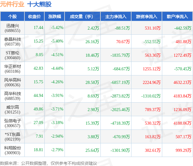 个股表现方面,元件行业当日领跌股为迅捷兴(688655),该股当日报收17.44,下跌5.42%,成交量2.42万,主力资金净流出88.51万元。泰晶科技(603738)以下跌5.4%紧随其后,该股当日成交量26.16万,主力资金净流入70.67万元。除此之外,ST惠伦(300460)、华正新材(603186)、风华高科(000636)均进入当日熊股之列。具体个股列表见下表: