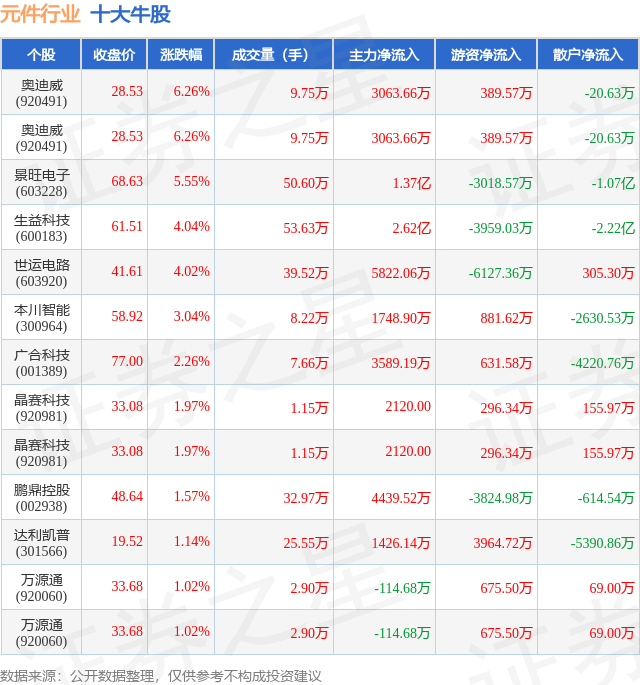 个股表现方面,元件行业当日领涨股为奥迪威(920491),该股当日报收28.53,上涨6.26%,成交量9.75万,主力资金净流入3063.66万元。奥迪威(920491)以上涨6.26%紧随其后,该股当日成交量9.75万,主力资金净流入3063.66万元。除此之外,景旺电子(603228)、生益科技(600183)、世运电路(603920)均进入当日牛股之列。具体个股列表见下表: