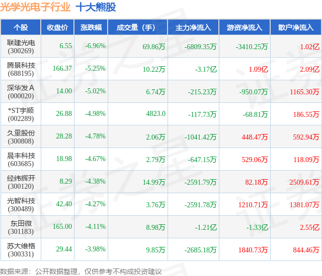 个股表现方面,光学光电子行业当日领跌股为联建光电(300269),该股当日报收6.55,下跌6.96%,成交量69.86万,主力资金净流出6809.35万元。腾景科技(688195)以下跌5.25%紧随其后,该股当日成交量10.22万,主力资金净流出3.17亿元。除此之外,深华发A(000020)、*ST宇顺(002289)、久量股份(300808)均进入当日熊股之列。具体个股列表见下表: