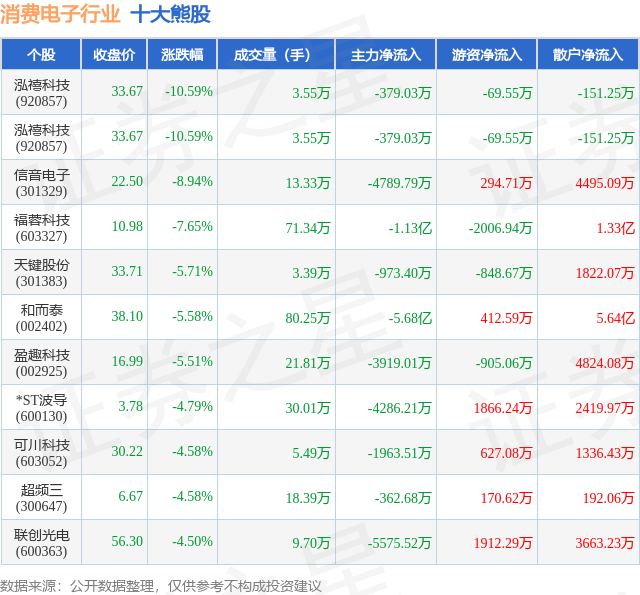 个股表现方面,消费电子行业当日领跌股为泓禧科技(920857),该股当日报收33.67,下跌10.59%,成交量3.55万,主力资金净流出379.03万元。泓禧科技(920857)以下跌10.59%紧随其后,该股当日成交量3.55万,主力资金净流出379.03万元。除此之外,信音电子(301329)、福蓉科技(603327)、天键股份(301383)均进入当日熊股之列。具体个股列表见下表: