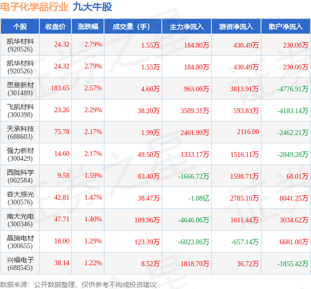 个股表现方面,电子化学品行业当日领涨股为凯华材料(920526),该股当日报收24.32,上涨2.79%,成交量1.55万,主力资金净流入184.8万元。凯华材料(920526)以上涨2.79%紧随其后,该股当日成交量1.55万,主力资金净流入184.8万元。除此之外,思泉新材(301489)、飞凯材料(300398)、天承科技(688603)均进入当日牛股之列。具体个股列表见下表: