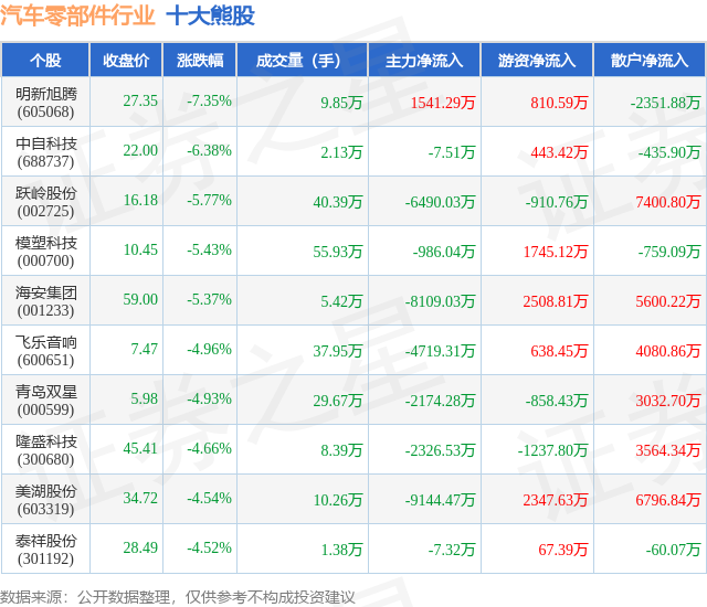 个股表现方面,汽车零部件行业当日领跌股为明新旭腾(605068),该股当日报收27.35,下跌7.35%,成交量9.85万,主力资金净流入1541.29万元。中自科技(688737)以下跌6.38%紧随其后,该股当日成交量2.13万,主力资金净流出7.51万元。除此之外,跃岭股份(002725)、模塑科技(000700)、海安集团(001233)均进入当日熊股之列。具体个股列表见下表:
