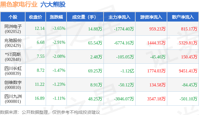个股表现方面,黑色家电行业当日领跌股为同洲电子(002052),该股当日报收12.14,下跌3.65%,成交量14.88万,主力资金净流出1774.4万元。兆驰股份(002429)以下跌2.91%紧随其后,该股当日成交量65.54万,主力资金净流出6774.16万元。除此之外,*ST高斯(002848)、四川长虹(600839)、创维数字(000810)均进入当日熊股之列。具体个股列表见下表: