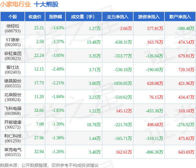 个股表现方面,小家电行业当日领跌股为倍轻松(688793),该股当日报收25.21,下跌3.63%,成交量1.27万,主力资金净流入2.66万元。ST德豪(002005)以下跌3.37%紧随其后,该股当日成交量13.48万,主力资金净流出638.31万元。除此之外,彩虹集团(003023)、爱仕达(002403)、德昌股份(605555)均进入当日熊股之列。具体个股列表见下表: