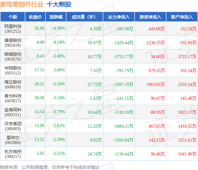 个股表现方面,家电零部件行业当日领跌股为同星科技(301252),该股当日报收26.69,下跌4.98%,成交量4.39万,主力资金净流出595.58万元。康盛股份(002418)以下跌4.14%紧随其后,该股当日成交量50.97万,主力资金净流出1429.44万元。除此之外,顺威股份(002676)、华翔股份(603112)、海立股份(600619)均进入当日熊股之列。具体个股列表见下表: