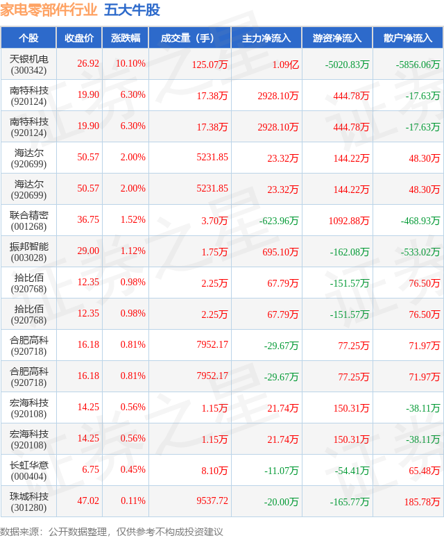 个股表现方面,家电零部件行业当日领涨股为天银机电(300342),该股当日报收26.92,上涨10.1%,成交量125.07万,主力资金净流入1.09亿元。南特科技(920124)以上涨6.3%紧随其后,该股当日成交量17.38万,主力资金净流入2928.1万元。除此之外,南特科技(920124)、海达尔(920699)、海达尔(920699)均进入当日牛股之列。具体个股列表见下表: