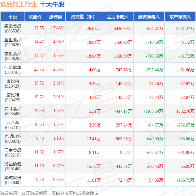 个股表现方面,食品加工行业当日领涨股为惠发食品(603536),该股当日报收12.55,上涨5.46%,成交量26.03万,主力资金净流入4436.9万元。盖世食品(920826)以上涨4.03%紧随其后,该股当日成交量18.04万,主力资金净流入1160.9万元。除此之外,盖世食品(920826)、仙乐健康(300791)、康比特(920429)均进入当日牛股之列。具体个股列表见下表: