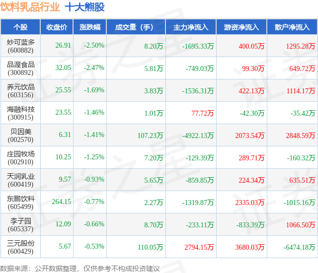 个股表现方面,饮料乳品行业当日领跌股为妙可蓝多(600882),该股当日报收26.91,下跌2.5%,成交量8.2万,主力资金净流出1695.33万元。品渥食品(300892)以下跌2.47%紧随其后,该股当日成交量5.81万,主力资金净流出749.03万元。除此之外,养元饮品(603156)、海融科技(300915)、贝因美(002570)均进入当日熊股之列。具体个股列表见下表: