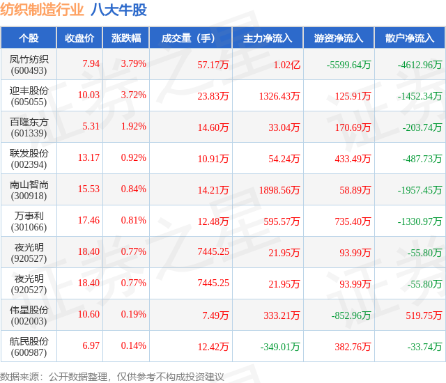 个股表现方面,纺织制造行业当日领涨股为凤竹纺织(600493),该股当日报收7.94,上涨3.79%,成交量57.17万,主力资金净流入1.02亿元。迎丰股份(605055)以上涨3.72%紧随其后,该股当日成交量23.83万,主力资金净流入1326.43万元。除此之外,百隆东方(601339)、联发股份(002394)、南山智尚(300918)均进入当日牛股之列。具体个股列表见下表: