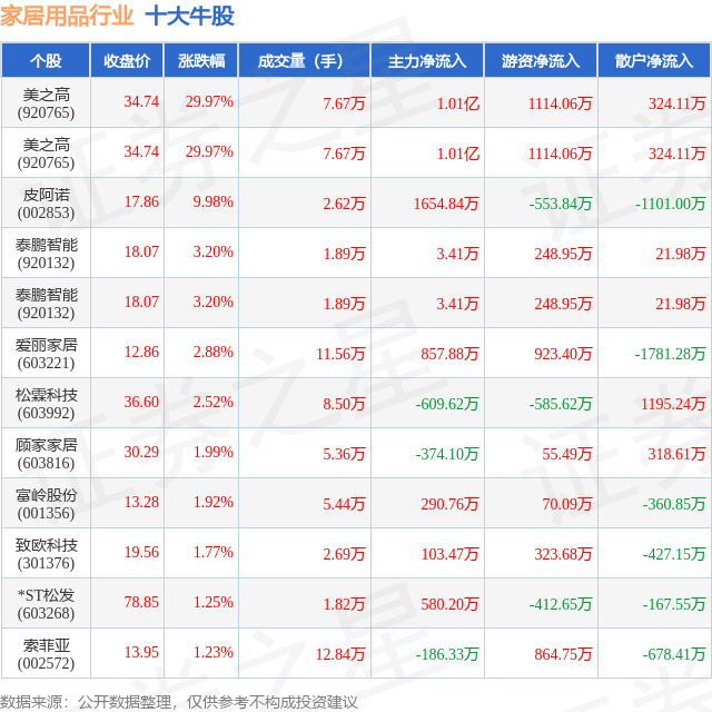 个股表现方面,家居用品行业当日领涨股为美之高(920765),该股当日报收34.74,上涨29.97%,成交量7.67万,主力资金净流入1.01亿元。美之高(920765)以上涨29.97%紧随其后,该股当日成交量7.67万,主力资金净流入1.01亿元。除此之外,皮阿诺(002853)、泰鹏智能(920132)、泰鹏智能(920132)均进入当日牛股之列。具体个股列表见下表: