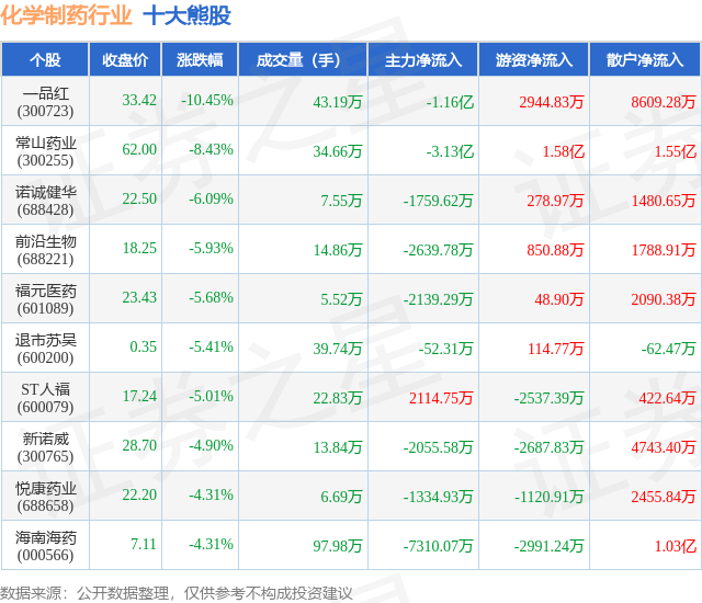 个股表现方面,化学制药行业当日领跌股为一品红(300723),该股当日报收33.42,下跌10.45%,成交量43.19万,主力资金净流出1.16亿元。常山药业(300255)以下跌8.43%紧随其后,该股当日成交量34.66万,主力资金净流出3.13亿元。除此之外,诺诚健华(688428)、前沿生物(688221)、福元医药(601089)均进入当日熊股之列。具体个股列表见下表: