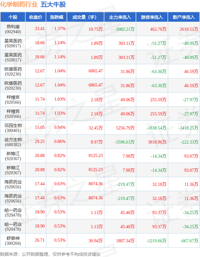 个股表现方面,化学制药行业当日领涨股为昂利康(002940),该股当日报收33.41,上涨1.37%,成交量10.75万,主力资金净流出3082.21万元。星昊医药(920017)以上涨1.14%紧随其后,该股当日成交量1.89万,主力资金净流入303.11万元。除此之外,星昊医药(920017)、欧康医药(920230)、欧康医药(920230)均进入当日牛股之列。具体个股列表见下表: