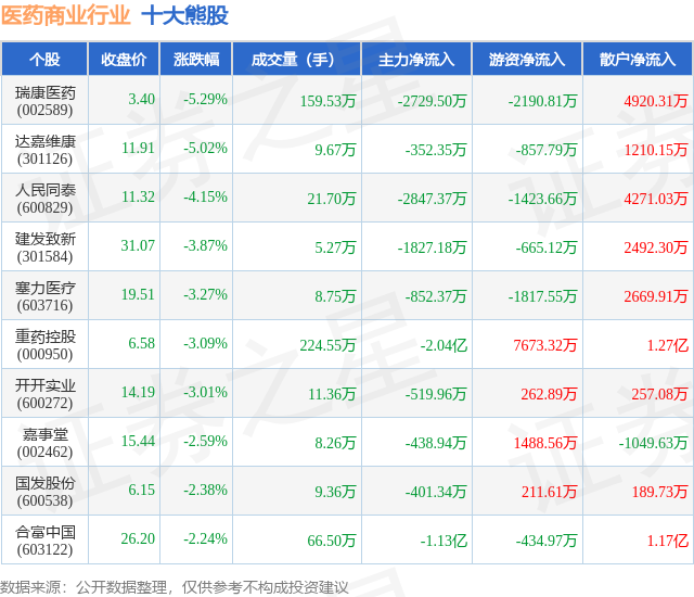 个股表现方面,医药商业行业当日领跌股为瑞康医药(002589),该股当日报收3.4,下跌5.29%,成交量159.53万,主力资金净流出2729.5万元。达嘉维康(301126)以下跌5.02%紧随其后,该股当日成交量9.67万,主力资金净流出352.35万元。除此之外,人民同泰(600829)、建发致新(301584)、塞力医疗(603716)均进入当日熊股之列。具体个股列表见下表: