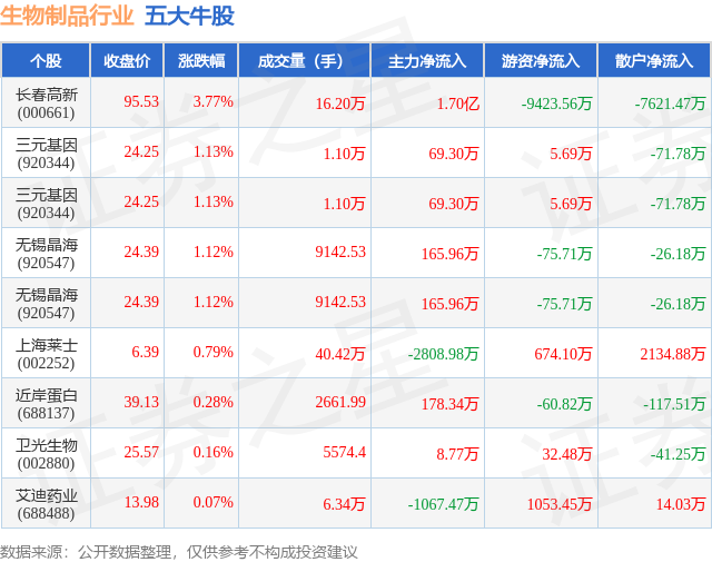 个股表现方面,生物制品行业当日领涨股为长春高新(000661),该股当日报收95.53,上涨3.77%,成交量16.2万,主力资金净流入1.7亿元。三元基因(920344)以上涨1.13%紧随其后,该股当日成交量1.1万,主力资金净流入69.3万元。除此之外,三元基因(920344)、无锡晶海(920547)、无锡晶海(920547)均进入当日牛股之列。具体个股列表见下表: