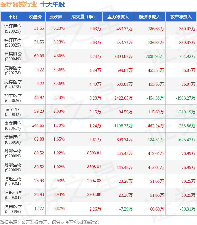 个股表现方面,医疗器械行业当日领涨股为锦好医疗(920925),该股当日报收31.55,上涨6.23%,成交量2.03万,主力资金净流入453.72万元。锦好医疗(920925)以上涨6.23%紧随其后,该股当日成交量2.03万,主力资金净流入453.72万元。除此之外,福瑞股份(300049)、鹿得医疗(920278)、鹿得医疗(920278)均进入当日牛股之列。具体个股列表见下表: