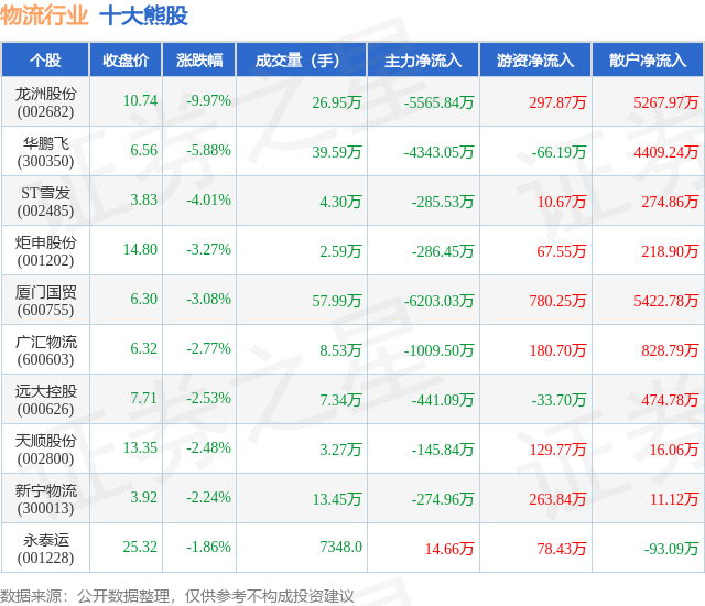 个股表现方面,物流行业当日领跌股为龙洲股份(002682),该股当日报收10.74,下跌9.97%,成交量26.95万,主力资金净流出5565.84万元。华鹏飞(300350)以下跌5.88%紧随其后,该股当日成交量39.59万,主力资金净流出4343.05万元。除此之外,ST雪发(002485)、炬申股份(001202)、厦门国贸(600755)均进入当日熊股之列。具体个股列表见下表: