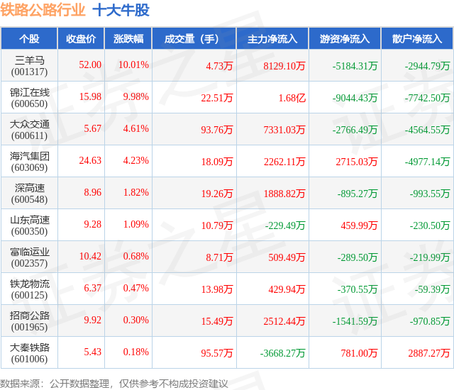 个股表现方面,铁路公路行业当日领涨股为三羊马(001317),该股当日报收52.0,上涨10.01%,成交量4.73万,主力资金净流入8129.1万元。锦江在线(600650)以上涨9.98%紧随其后,该股当日成交量22.51万,主力资金净流入1.68亿元。除此之外,大众交通(600611)、海汽集团(603069)、深高速(600548)均进入当日牛股之列。具体个股列表见下表: