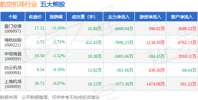 个股表现方面,航空机场行业当日领跌股为厦门空港(600897),该股当日报收17.12,下跌5.1%,成交量16.88万,主力资金净流出4000.04万元。海航控股(600221)以下跌1.71%紧随其后,该股当日成交量422.43万,主力资金净流出7896.23万元。除此之外,中信海直(000099)、白云机场(600004)、上海机场(600009)均进入当日熊股之列。具体个股列表见下表: