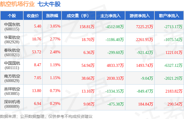 个股表现方面,航空机场行业当日领涨股为中国东航(600115),该股当日报收5.4,上涨3.05%,成交量158.81万,主力资金净流出4512.08万元。华夏航空(002928)以上涨2.77%紧随其后,该股当日成交量18.7万,主力资金净流出1186.4万元。除此之外,春秋航空(601021)、中国国航(601111)、南方航空(600029)均进入当日牛股之列。具体个股列表见下表: