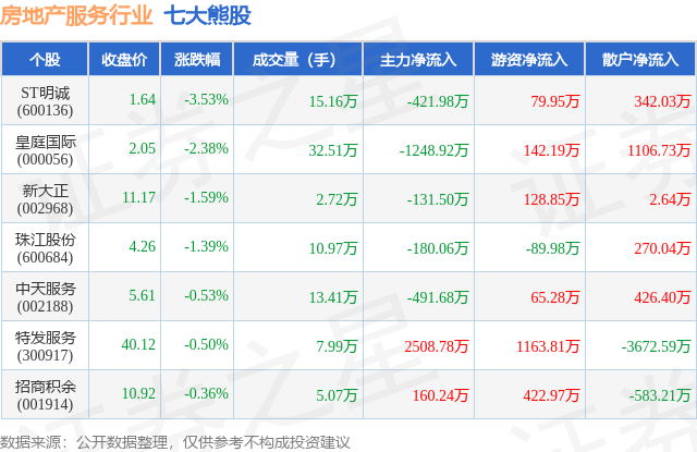个股表现方面,房地产服务行业当日领跌股为ST明诚(600136),该股当日报收1.64,下跌3.53%,成交量15.16万,主力资金净流出421.98万元。皇庭国际(000056)以下跌2.38%紧随其后,该股当日成交量32.51万,主力资金净流出1248.92万元。除此之外,新大正(002968)、珠江股份(600684)、中天服务(002188)均进入当日熊股之列。具体个股列表见下表: