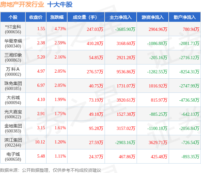 个股表现方面,房地产开发行业当日领涨股为*ST金科(000656),该股当日报收1.55,上涨4.73%,成交量247.03万,主力资金净流出3685.9万元。华夏幸福(600340)以上涨2.59%紧随其后,该股当日成交量410.28万,主力资金净流入3168.6万元。除此之外,三湘印象(000863)、万 科A(000002)、珠免集团(600185)均进入当日牛股之列。具体个股列表见下表: