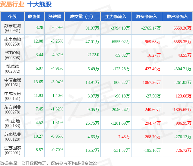 个股表现方面,贸易行业当日领跌股为苏豪汇鸿(600981),该股当日报收3.28,下跌6.29%,成交量91.07万,主力资金净流出3794.19万元。南京商旅(600250)以下跌5.25%紧随其后,该股当日成交量47.01万,主力资金净流出6555.02万元。除此之外,*ST沪科(600608)、凯瑞德(002072)、中信金属(601061)均进入当日熊股之列。具体个股列表见下表: