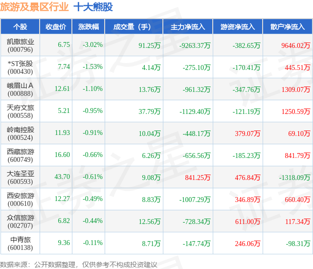 个股表现方面,旅游及景区行业当日领跌股为凯撒旅业(000796),该股当日报收6.75,下跌3.02%,成交量91.25万,主力资金净流出9263.37万元。*ST张股(000430)以下跌1.53%紧随其后,该股当日成交量4.14万,主力资金净流出275.1万元。除此之外,峨眉山A(000888)、天府文旅(000558)、岭南控股(000524)均进入当日熊股之列。具体个股列表见下表: