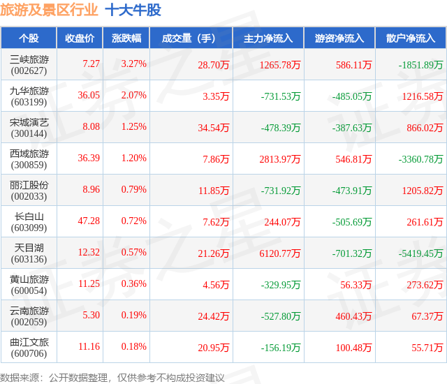 个股表现方面,旅游及景区行业当日领涨股为三峡旅游(002627),该股当日报收7.27,上涨3.27%,成交量28.7万,主力资金净流入1265.78万元。九华旅游(603199)以上涨2.07%紧随其后,该股当日成交量3.35万,主力资金净流出731.53万元。除此之外,宋城演艺(300144)、西域旅游(300859)、丽江股份(002033)均进入当日牛股之列。具体个股列表见下表:
