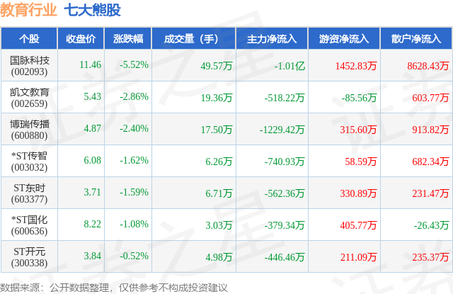 个股表现方面,教育行业当日领跌股为国脉科技(002093),该股当日报收11.46,下跌5.52%,成交量49.57万,主力资金净流出1.01亿元。凯文教育(002659)以下跌2.86%紧随其后,该股当日成交量19.36万,主力资金净流出518.22万元。除此之外,博瑞传播(600880)、*ST传智(003032)、ST东时(603377)均进入当日熊股之列。具体个股列表见下表:
