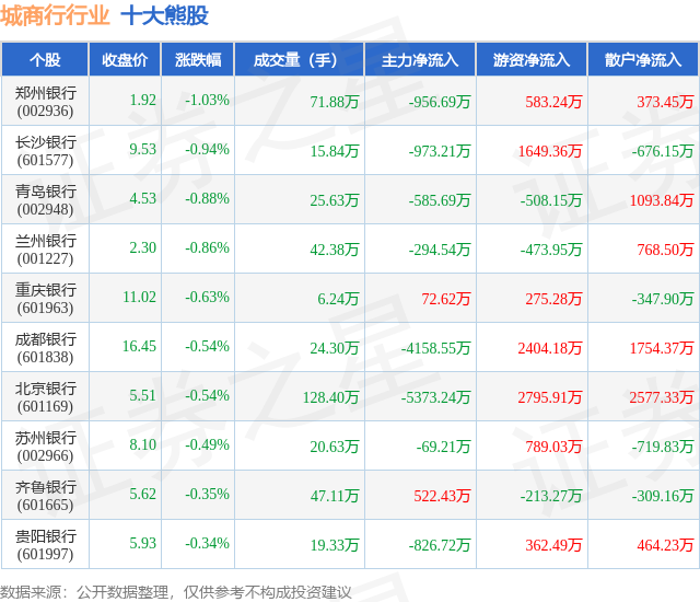 个股表现方面,城商行行业当日领跌股为郑州银行(002936),该股当日报收1.92,下跌1.03%,成交量71.88万,主力资金净流出956.69万元。长沙银行(601577)以下跌0.94%紧随其后,该股当日成交量15.84万,主力资金净流出973.21万元。除此之外,青岛银行(002948)、兰州银行(001227)、重庆银行(601963)均进入当日熊股之列。具体个股列表见下表: