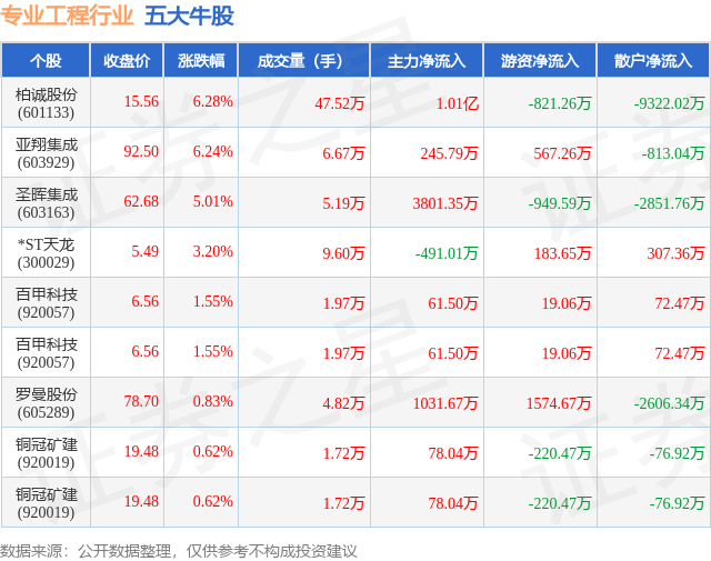 个股表现方面,专业工程行业当日领涨股为柏诚股份(601133),该股当日报收15.56,上涨6.28%,成交量47.52万,主力资金净流入1.01亿元。亚翔集成(603929)以上涨6.24%紧随其后,该股当日成交量6.67万,主力资金净流入245.79万元。除此之外,圣晖集成(603163)、*ST天龙(300029)、百甲科技(920057)均进入当日牛股之列。具体个股列表见下表: