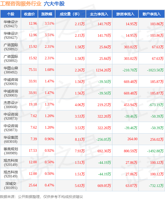 个股表现方面,工程咨询服务行业当日领涨股为华维设计(920427),该股当日报收12.96,上涨3.51%,成交量2.15万,主力资金净流入141.79万元。华维设计(920427)以上涨3.51%紧随其后,该股当日成交量2.15万,主力资金净流入141.79万元。除此之外,广咨国际(920892)、广咨国际(920892)、华图山鼎(300492)均进入当日牛股之列。具体个股列表见下表: