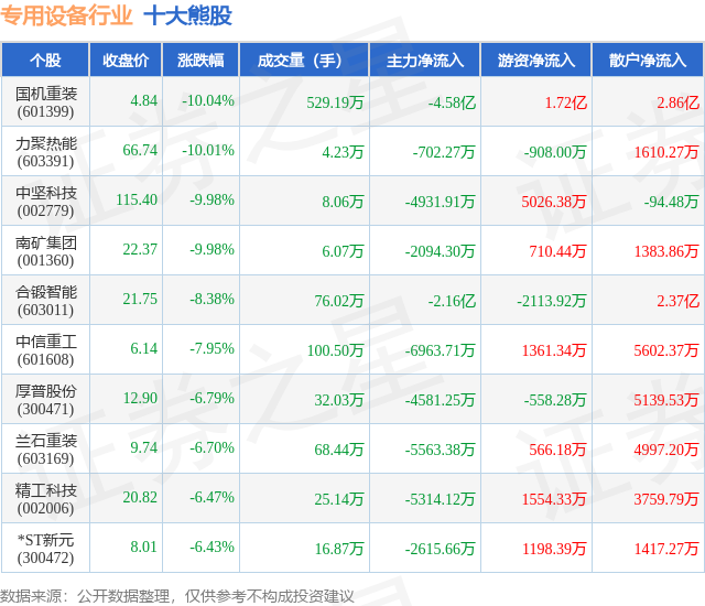 个股表现方面,专用设备行业当日领跌股为国机重装(601399),该股当日报收4.84,下跌10.04%,成交量529.19万,主力资金净流出4.58亿元。力聚热能(603391)以下跌10.01%紧随其后,该股当日成交量4.23万,主力资金净流出702.27万元。除此之外,中坚科技(002779)、南矿集团(001360)、合锻智能(603011)均进入当日熊股之列。具体个股列表见下表: