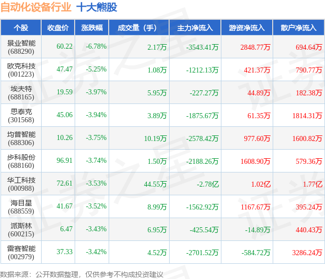 个股表现方面,自动化设备行业当日领跌股为景业智能(688290),该股当日报收60.22,下跌6.78%,成交量2.17万,主力资金净流出3543.41万元。欧克科技(001223)以下跌5.25%紧随其后,该股当日成交量1.08万,主力资金净流出1212.13万元。除此之外,埃夫特(688165)、思泰克(301568)、均普智能(688306)均进入当日熊股之列。具体个股列表见下表: