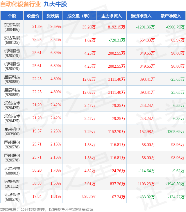 个股表现方面,自动化设备行业当日领涨股为东杰智能(300486),该股当日报收21.59,上涨9.59%,成交量35.2万,主力资金净流入8192.15万元。安达智能(688125)以上涨8.54%紧随其后,该股当日成交量1.82万,主力资金净流出720.31万元。除此之外,机科股份(920579)、机科股份(920579)、星辰科技(920885)均进入当日牛股之列。具体个股列表见下表: