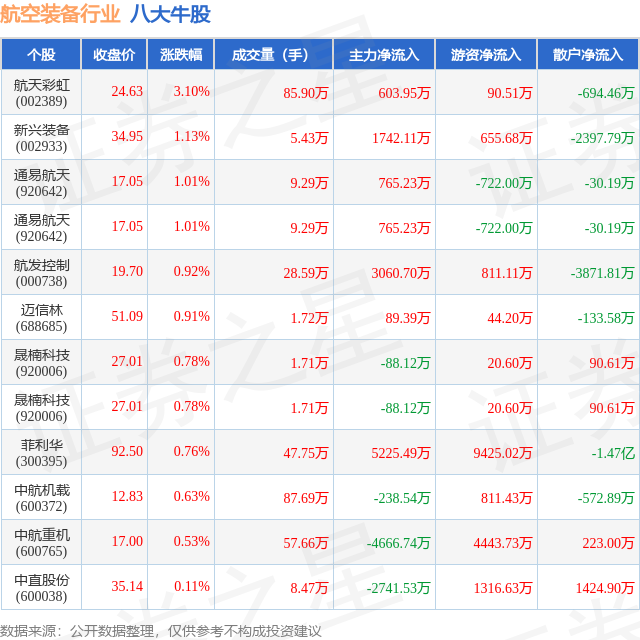 个股表现方面,航空装备行业当日领涨股为航天彩虹(002389),该股当日报收24.63,上涨3.1%,成交量85.9万,主力资金净流入603.95万元。新兴装备(002933)以上涨1.13%紧随其后,该股当日成交量5.43万,主力资金净流入1742.11万元。除此之外,通易航天(920642)、通易航天(920642)、航发控制(000738)均进入当日牛股之列。具体个股列表见下表:
