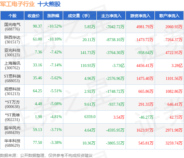 个股表现方面,军工电子行业当日领跌股为国光电气(688776),该股当日报收90.37,下跌10.52%,成交量5.85万,主力资金净流出7042.72万元。陕西华达(301517)以下跌10.1%紧随其后,该股当日成交量20.11万,主力资金净流出8738.1万元。除此之外,亚光科技(300123)、上海瀚讯(300762)、ST思科瑞(688053)均进入当日熊股之列。具体个股列表见下表: