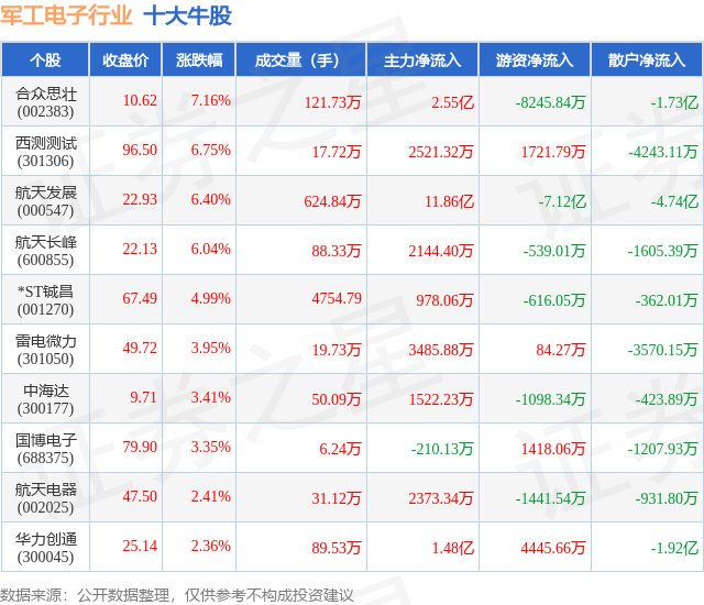 个股表现方面,军工电子行业当日领涨股为合众思壮(002383),该股当日报收10.62,上涨7.16%,成交量121.73万,主力资金净流入2.55亿元。西测测试(301306)以上涨6.75%紧随其后,该股当日成交量17.72万,主力资金净流入2521.32万元。除此之外,航天发展(000547)、航天长峰(600855)、*ST铖昌(001270)均进入当日牛股之列。具体个股列表见下表: