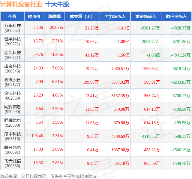 个股表现方面,计算机设备行业当日领涨股为万集科技(300552),该股当日报收28.06,上涨20.02%,成交量21.23万,主力资金净流入1.41亿元。智莱科技(300771)以上涨15.71%紧随其后,该股当日成交量70.67万,主力资金净流入1.08亿元。除此之外,创识科技(300941)、雄帝科技(300546)、御银股份(002177)均进入当日牛股之列。具体个股列表见下表: