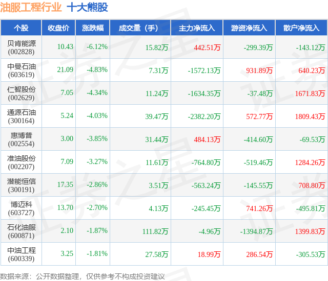 个股表现方面,油服工程行业当日领跌股为贝肯能源(002828),该股当日报收10.43,下跌6.12%,成交量15.82万,主力资金净流入442.51万元。中曼石油(603619)以下跌4.83%紧随其后,该股当日成交量7.31万,主力资金净流出1572.13万元。除此之外,仁智股份(002629)、通源石油(300164)、惠博普(002554)均进入当日熊股之列。具体个股列表见下表: