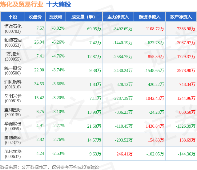个股表现方面,炼化及贸易行业当日领跌股为恒逸石化(000703),该股当日报收7.57,下跌8.02%,成交量69.95万,主力资金净流出8492.69万元。和顺石油(603353)以下跌6.26%紧随其后,该股当日成交量7.42万,主力资金净流出1440.19万元。除此之外,万邦达(300055)、统一股份(600506)、润贝航科(001316)均进入当日熊股之列。具体个股列表见下表: