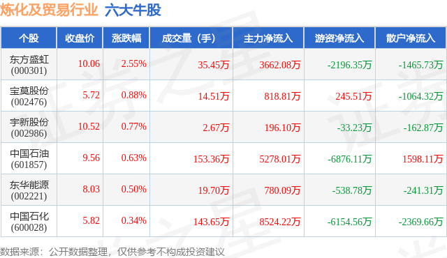 个股表现方面,炼化及贸易行业当日领涨股为东方盛虹(000301),该股当日报收10.06,上涨2.55%,成交量35.45万,主力资金净流入3662.08万元。宝莫股份(002476)以上涨0.88%紧随其后,该股当日成交量14.51万,主力资金净流入818.81万元。除此之外,宇新股份(002986)、中国石油(601857)、东华能源(002221)均进入当日牛股之列。具体个股列表见下表: