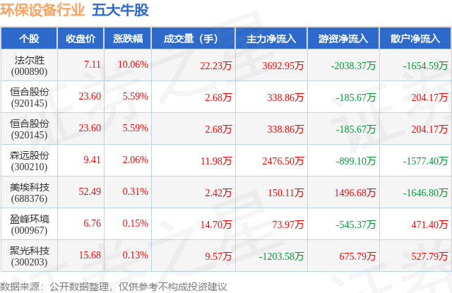个股表现方面,环保设备行业当日领涨股为法尔胜(000890),该股当日报收7.11,上涨10.06%,成交量22.23万,主力资金净流入3692.95万元。恒合股份(920145)以上涨5.59%紧随其后,该股当日成交量2.68万,主力资金净流入338.86万元。除此之外,恒合股份(920145)、森远股份(300210)、美埃科技(688376)均进入当日牛股之列。具体个股列表见下表: