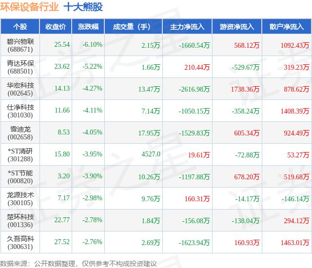 个股表现方面,环保设备行业当日领跌股为碧兴物联(688671),该股当日报收25.54,下跌6.1%,成交量2.15万,主力资金净流出1660.54万元。青达环保(688501)以下跌5.22%紧随其后,该股当日成交量1.66万,主力资金净流入210.44万元。除此之外,华宏科技(002645)、仕净科技(301030)、雪迪龙(002658)均进入当日熊股之列。具体个股列表见下表: