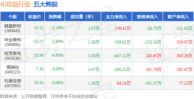 个股表现方面,化妆品行业当日领跌股为锦盛新材(300849),该股当日报收16.15,下跌2.18%,成交量2.87万,主力资金净流入178.41万元。华业香料(300886)以下跌1.6%紧随其后,该股当日成交量1.3万,主力资金净流出358.81万元。除此之外,拉芳家化(603630)、福瑞达(600223)、丸美生物(603983)均进入当日熊股之列。具体个股列表见下表: